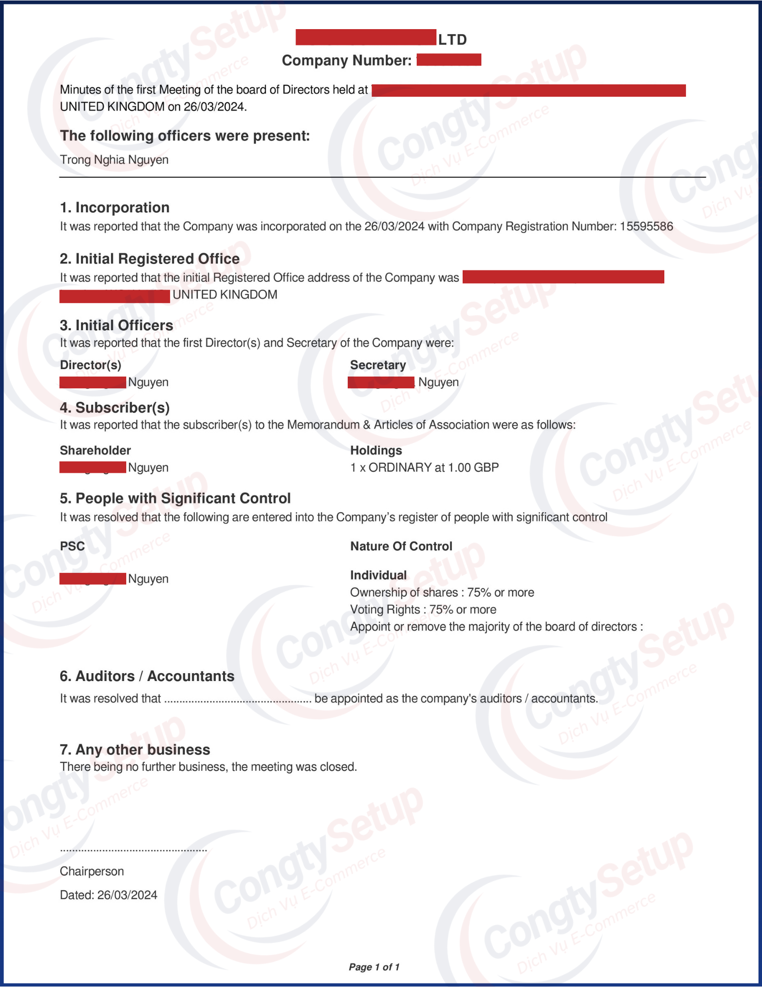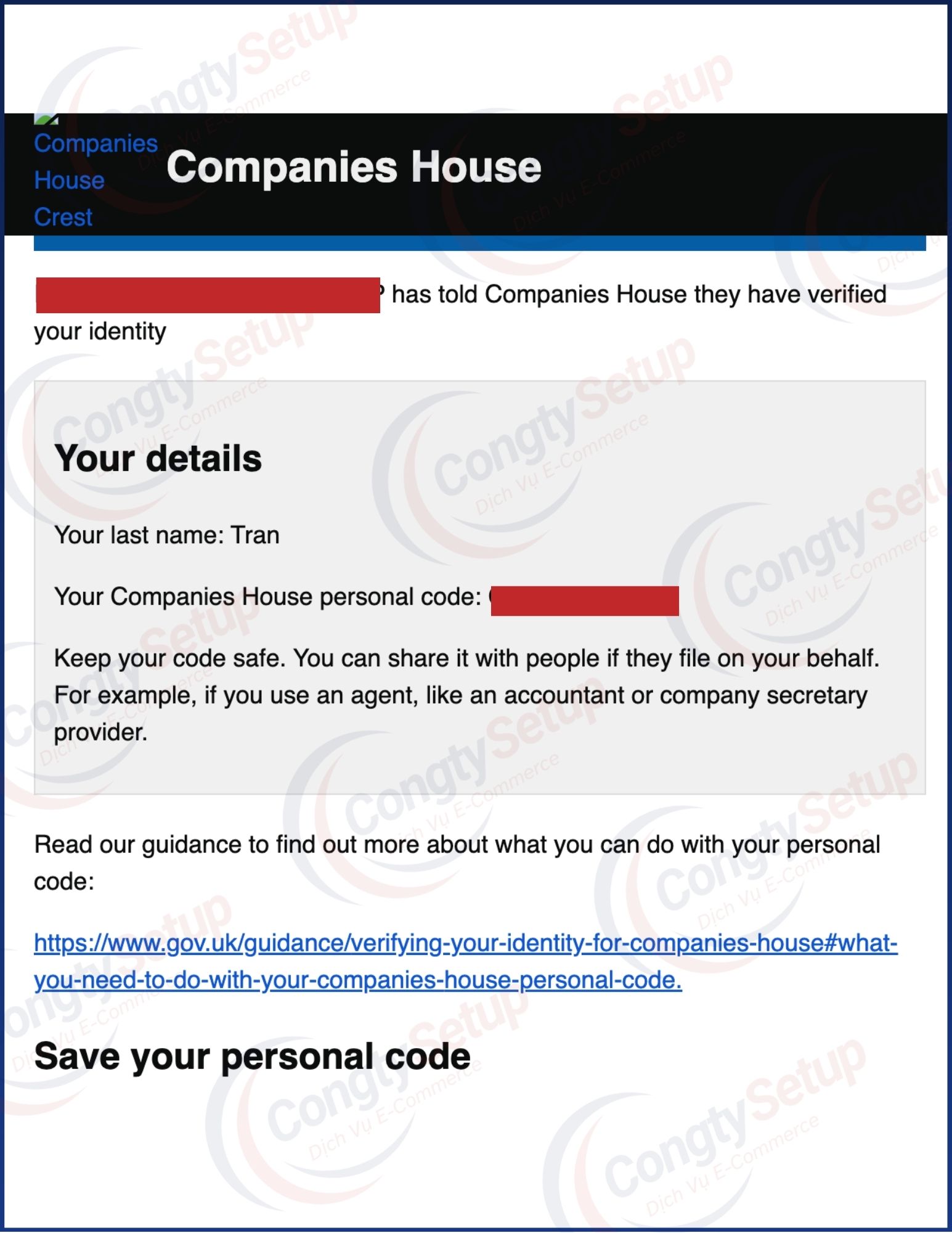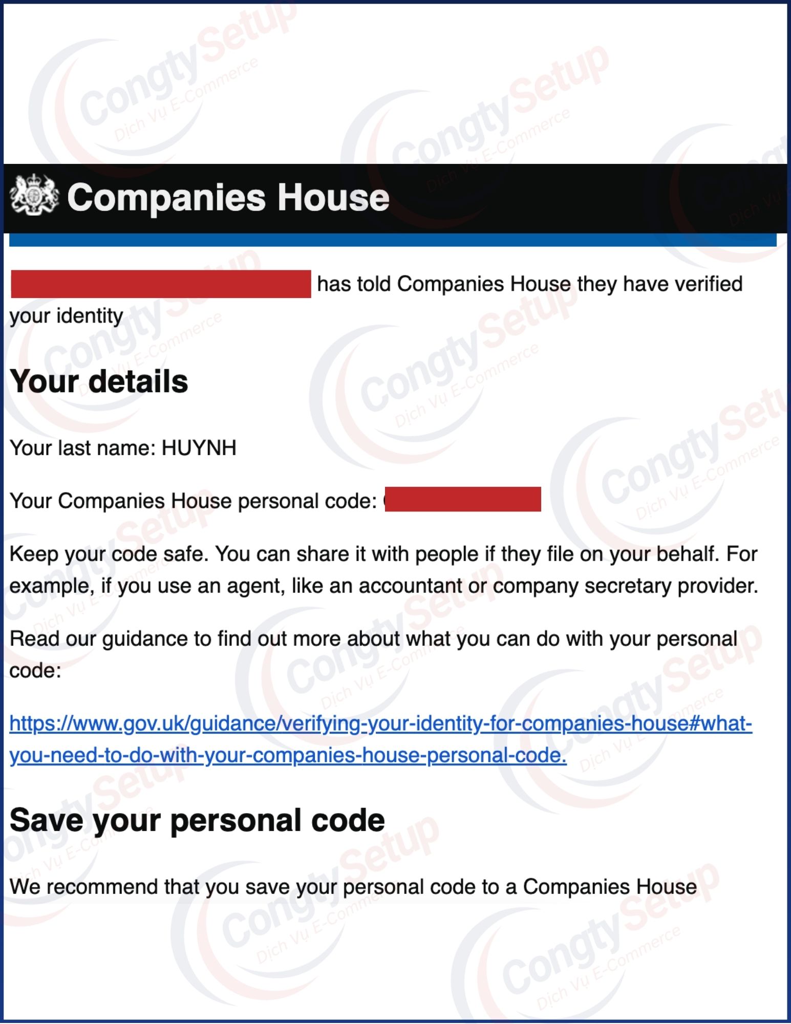 CongtySetup thực hiện xác minh Director & PSC thông qua Authorised Corporate Service Provider (ACSP) được Companies House ủy quyền, hỗ trợ nhận Companies House Personal Code hợp lệ, 100% online.